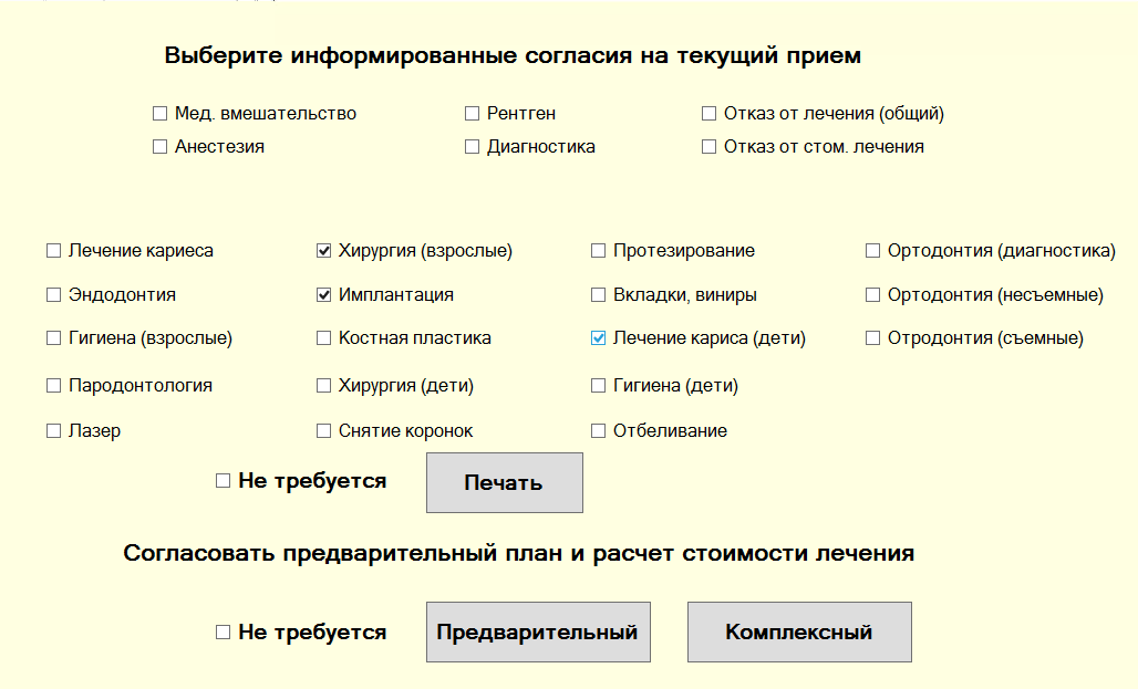 Контроль и печать информированных согласий, позволяет не забыть взять подпись у пациента на этот важный документ. Автоподстановка данных пациенты в бланк ускоряет заполнение ИДС